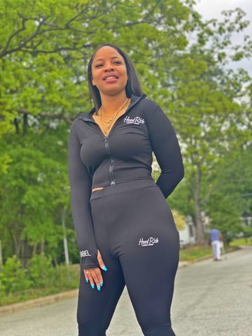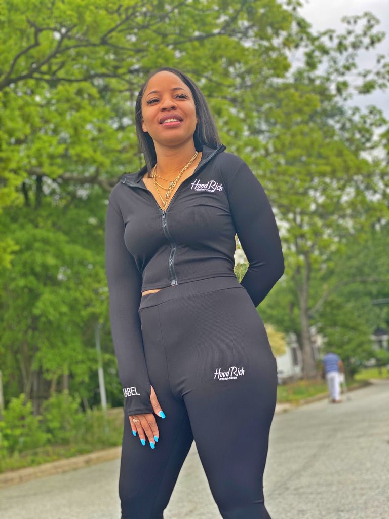 This is our black “Lucky” set. It’s a two piece that comes in a great material that hugs the body. Also has long sleeve with hand wholes! Runs true to size.